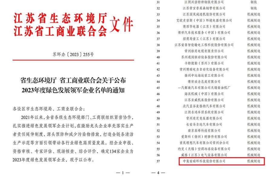 近期,江蘇省生態(tài)環(huán)境廳與江蘇省工商業(yè)聯(lián)合會聯(lián)合發(fā)布“2023年度綠色發(fā)展領(lǐng)軍企業(yè)”名單,中集安瑞環(huán)科技股份有限公司上榜。
